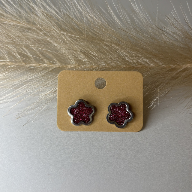 Clous d’oreille fleur rose paillettes